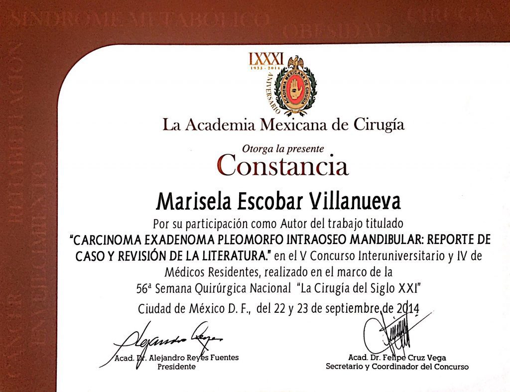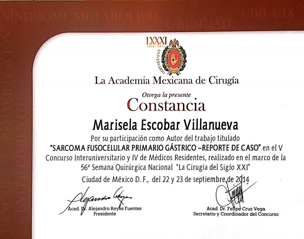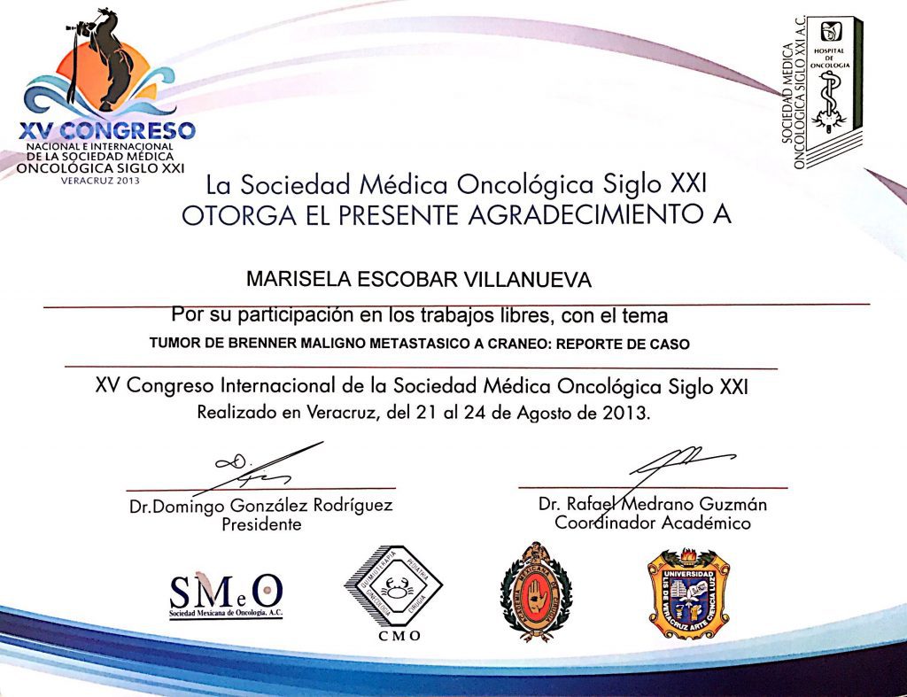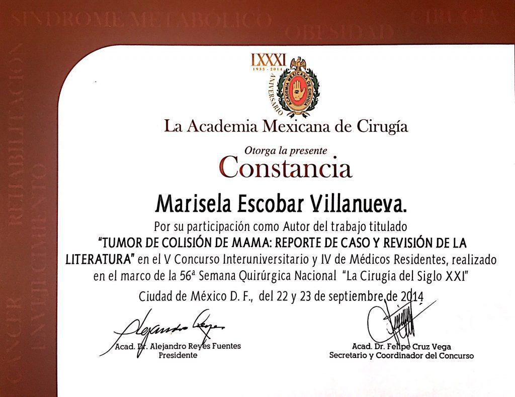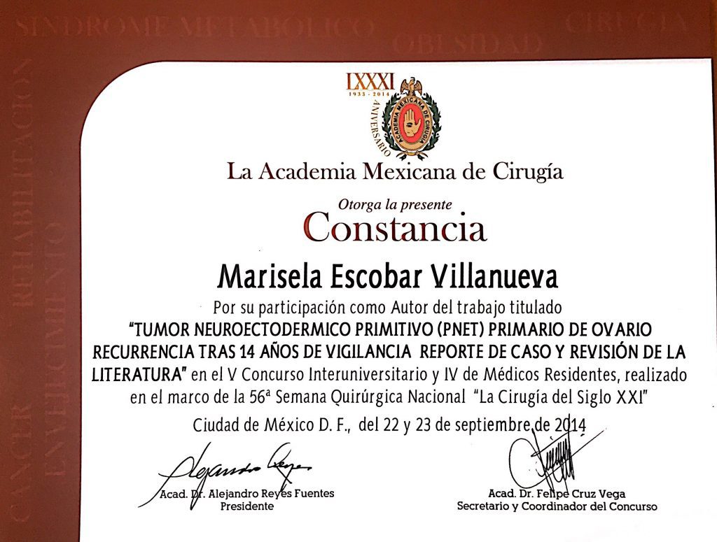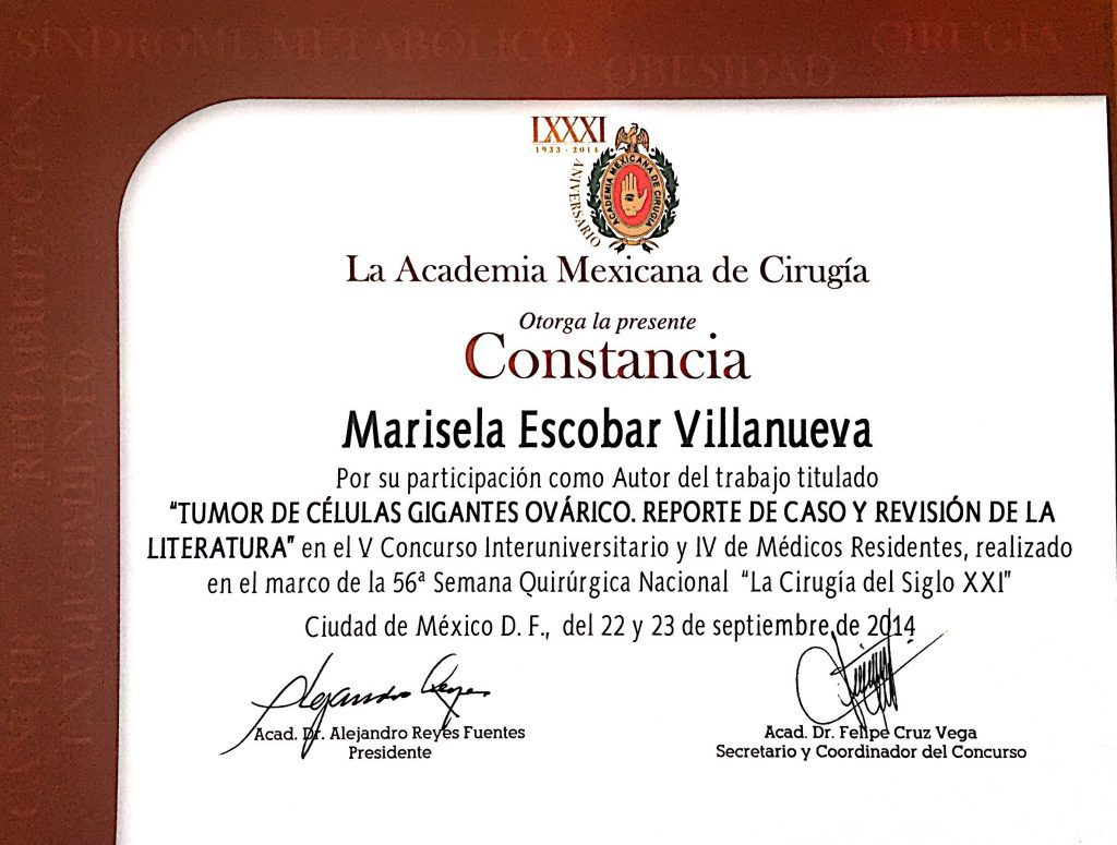 • Primer lugar en examen de consejo de certificación de Ginecología Oncológica por el Consejo Mexicano de Oncología.